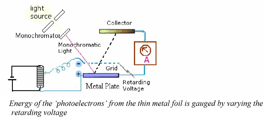 In Lenard’s experiment, a power supply with an adjustable voltage is used to show that it is the increasing frequency of the light (or one can refer to the light as an electromagnetic force), that induces an increasing current flow reaction on the metal. There is a separation of electrons from the atoms of the metal, making positive ions and K.E electrons. This will happen with varying amounts of flow of electrons through the micro ammeter due to the frequency of the incident light applied. The incident light is an electromotive force (EMF) applied to the metal surface and Lenard found the greater the frequency of the EMF, would result in a greater frequency of electrons measured through the ammeter. The flow of electrons could be stopped by increasing the retarding voltage on the negative charged grid. This is because the increased negative voltage would stop the flow of the measured current due to the negative repulsion force being increased towards the photocell, and hence repulsing the negative electrons. Lenard suggests in this experiment how force measured by the frequency of light, has a curved linear relationship with the flow of electrons from a metal. Temperature change was not a consideration in the experiment set up, (and maybe not possible at this time in history due to technology requirements) and was not linked to a time parameter There was no observation possible to see the Endothermic Electric Effect reaction being caused by the emission of an electron from the atom.