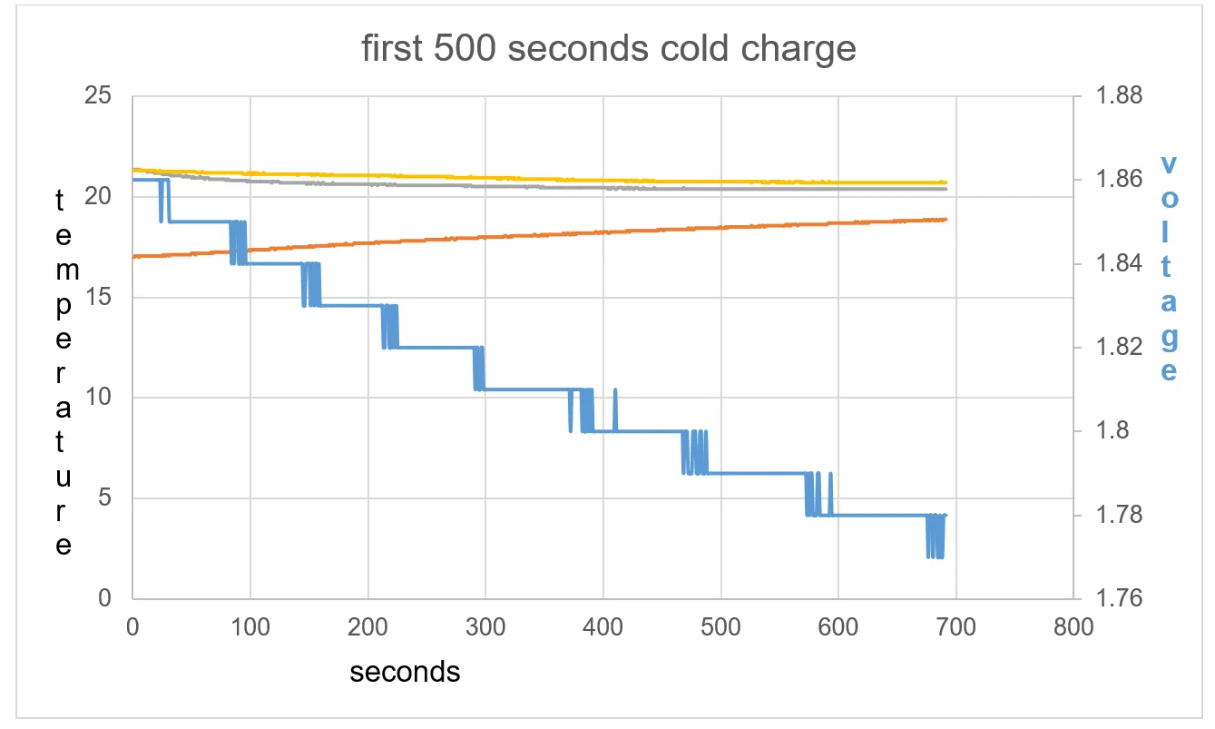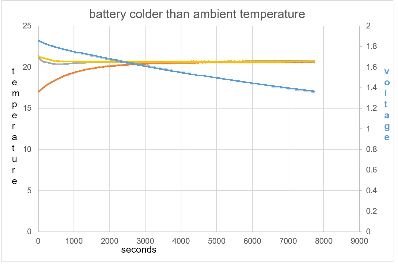 Samsung 18650 Battery was used. The battery was first cooled in the fridge to below ambient room temperature. The objective was to see if the charge behaved the same as when the battery starting temperature was above ambient room temperature.