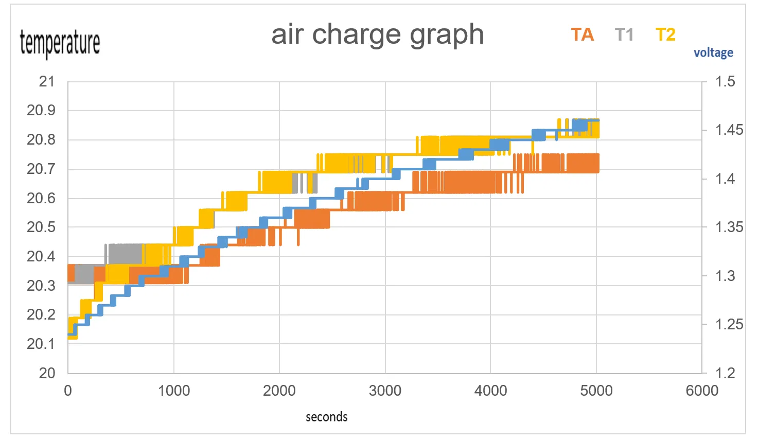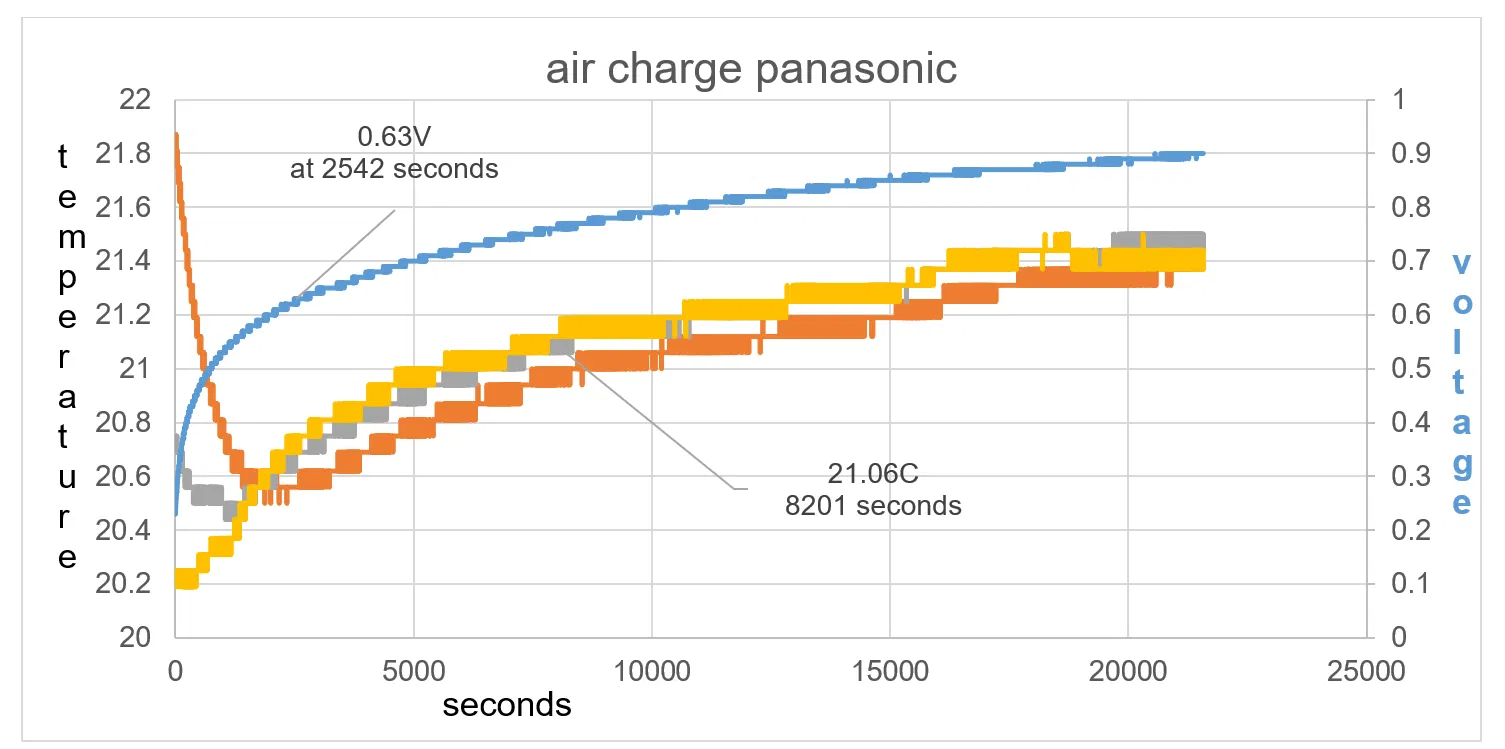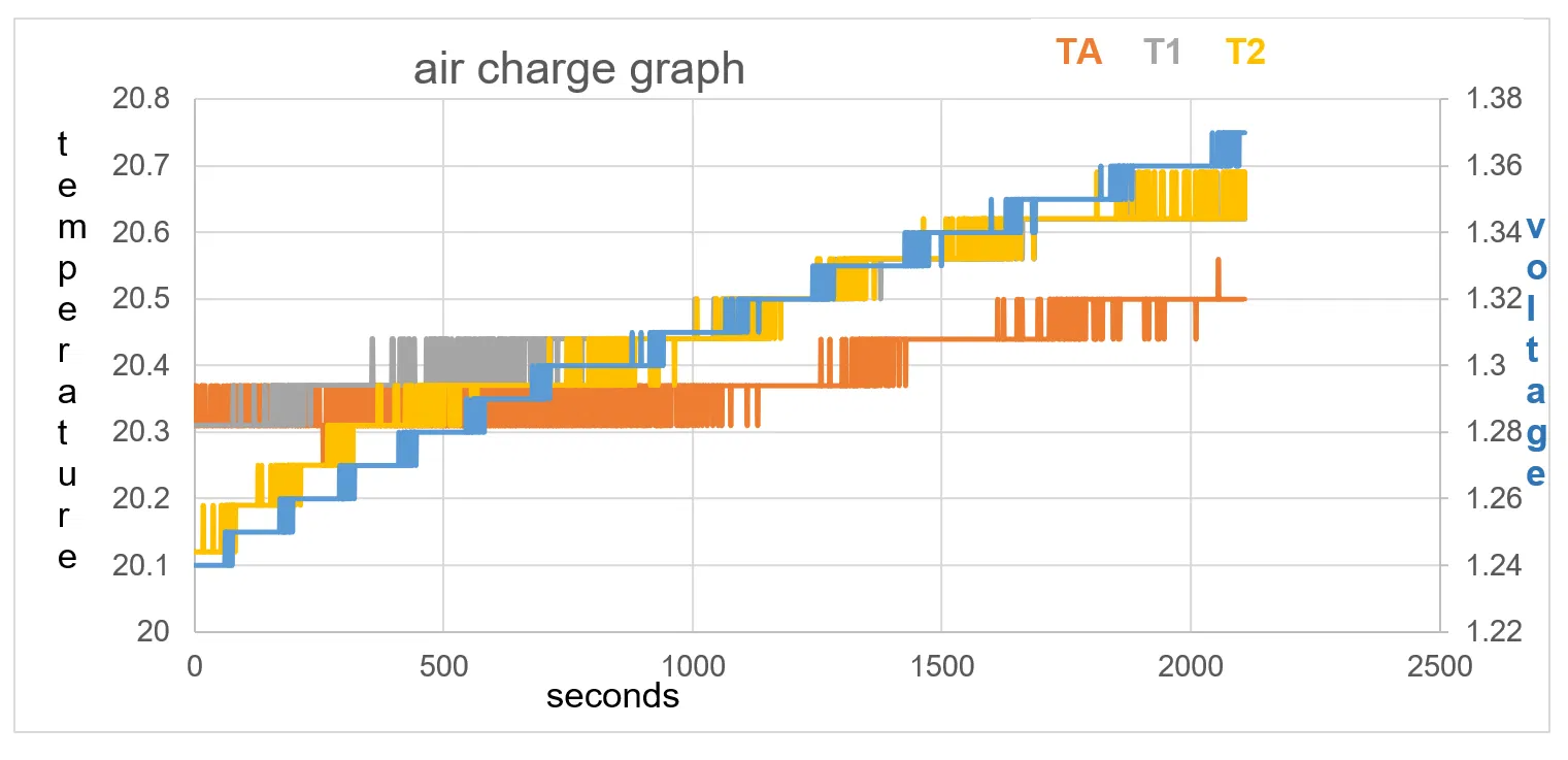 Figure 38: Overall data of time charge. TA drops in temperature by 1.4C in the first 2542 seconds and raises to 0.63V.