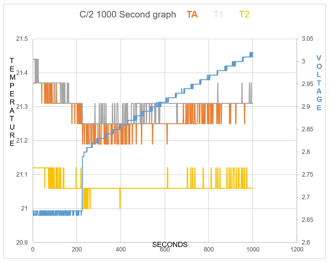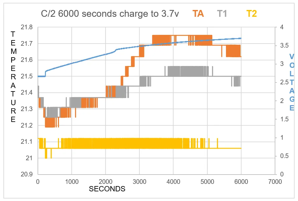 T1 positioned 15mm from battery initially reads the same temperature as the battery sensor TA. The voltage on blue line increases through 5000 seconds. The ambient temperature T2, and T1, increase in temperature throughout the data collection. TA remains the same temperature until 1250 seconds, not following the same temperature rise as T1 and T2. TA remains a cooler temperature from 750 seconds than T1 and T2 and does so throughout the rest of the data collection time.