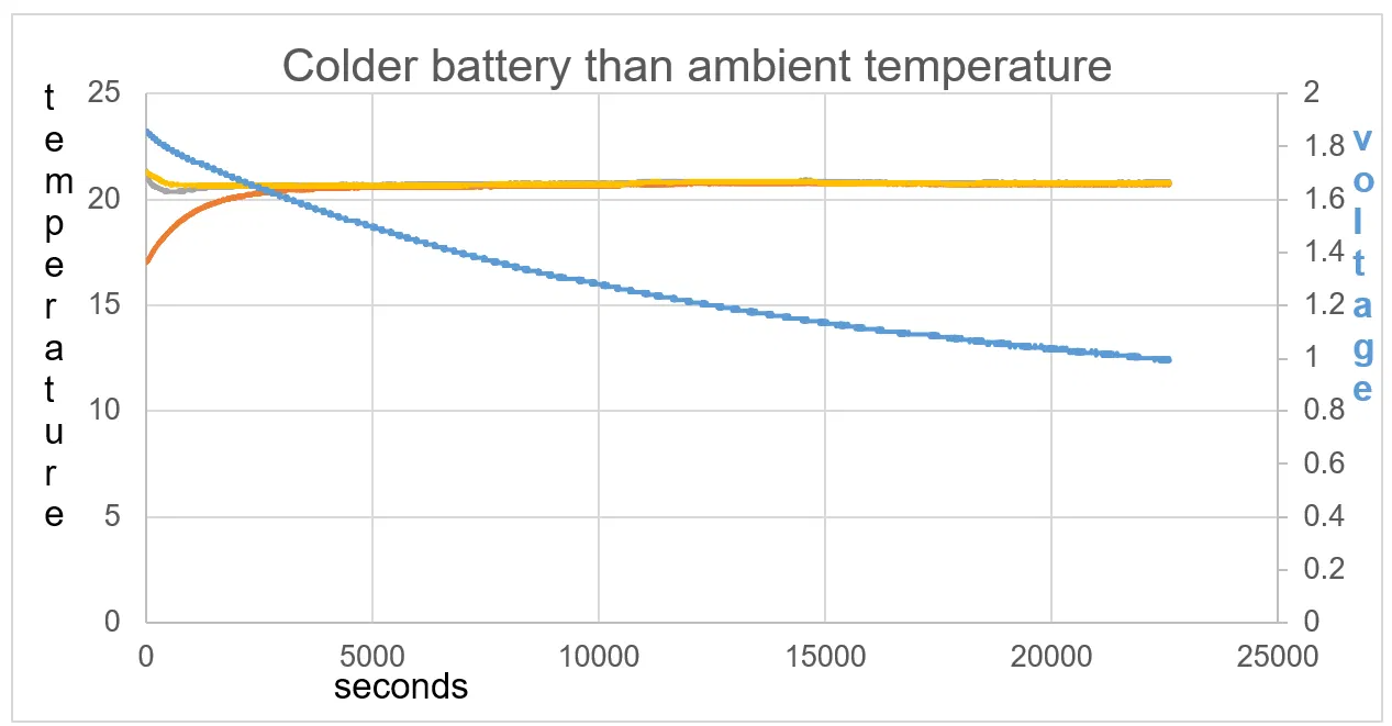 The initial exothermic action on the battery causes de-ionising and a drop in voltage. It seems when this reaction is started it will continue, as seen through 22,250 seconds.