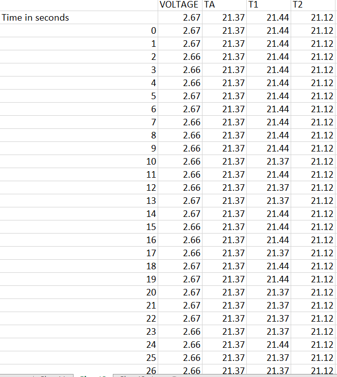 In this experiment the Sony 18650 battery was used. There was no voltage or current applied to the battery. The battery temperature TA is elevated by 0.2 C compared to the ambient temperature T2 at the start of data collection. This is due to applying thermal heat to the battery before connecting to the circuit and data collection. The battery was connected to the circuit and the voltage and temperature data was recorded with respect to time.